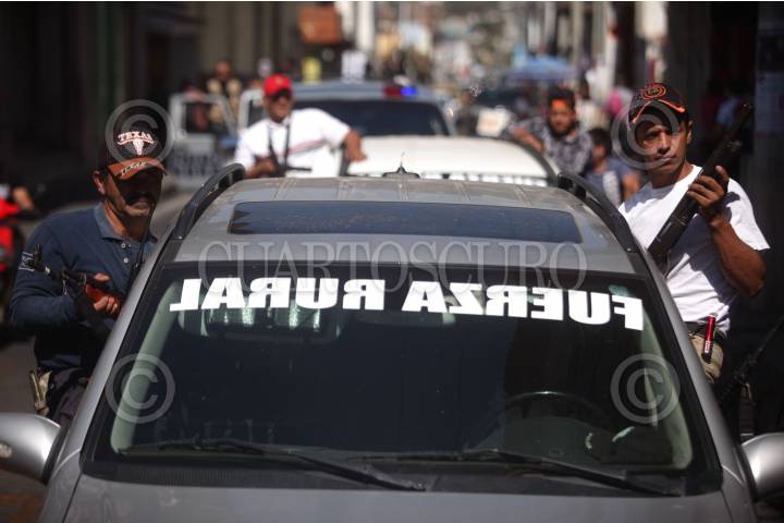 LOS REYES, MICHOACÁN, 28ENERO2015.- El día de hoy más de 100 elementos adscritos a la Fuerza Rural, festejaron el primer aniversario de haber ingresado a la cabecera municipal. Los elementos realizaron un recorrido por las principales calles en caravana y finalizaron con un evento en donde algunos de los comandantes se dirigieron al pueblo. FOTO: ALAN ORTEGA /CUARTOSCURO.COM