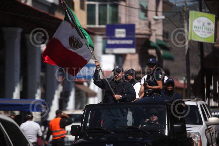 LOS REYES, MICHOACÁN, 28ENERO2015.- El día de hoy más de 100 elementos adscritos a la Fuerza Rural, festejaron el primer aniversario de haber ingresado a la cabecera municipal. Los elementos realizaron un recorrido por las principales calles en caravana y finalizaron con un evento en donde algunos de los comandantes se dirigieron al pueblo. FOTO: ALAN ORTEGA /CUARTOSCURO.COM