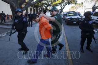 VERACRUZ, VERACRUZ, 28ENERO2015.- El escolta y chofer del alcalde de Medellín de Bravo y los dos motopatrulleros de la policial municipal, quienes están sujetos a proceso por la desaparición y muerte del reportero Moisés Sánchez Cerezo, fueron presentados en la Agencia Quinta del Ministerio Público para declarar en torno a los hechos. FOTO: FÉLIX MÁRQUEZ / CUARTOSCURO.COM