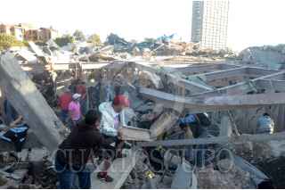 MEXICO, D.F., 29ENERO2015.- Un saldo preliminar de 7 muertos y más de 35 heridos hasta el momento, es lo que ha dejado una explosión ocasionada por una pipa de gas en el Hospital Materno Infantil de Cuajimalpa. De acuerdo con declaraciones del chofer de la pipa, la manguera del combustble presentaba una fuga, lo que incendió el gas y posteriormente estalló el cilindro. El hospital quedó practicamente reducido a escombros y varios civiles se unieron a las labores de retiro de escombros para agilizar los trabajos de búsqueda y rescate. FOTO: ARMANDO MONROY /CUARTOSCURO.COM