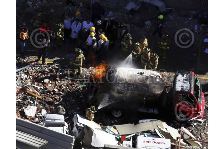 MEXICO, D.F., 29ENERO2015.- Un saldo preliminar de 2 muertos y más de 50 heridos hasta el momento, es lo que ha dejado una explosión ocasionada por una pipa de gas en el Hospital Materno Infantil de Cuajimalpa. De acuerdo con declaraciones del chofer de la pipa, la manguera del combustble presentaba una fuga, lo que incendió el gas y posteriormente estalló el cilindro. El hospital quedó prácticamente reducido a escombros. FOTO: IVÁN STEPHENS /CUARTOSCURO.COM