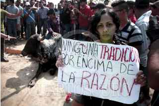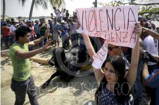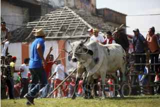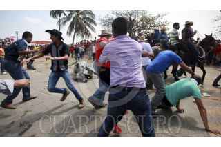 TLACOTALPAN, VERACRUZ, 01FEBRERO2015.- Este domingo se llevó a cabo el tradicional Embalse de Toros 2015, durante las fiestas de la Candelaria, dicho evento se realizó entre golpes y agresiones a los semovientes. Así mismo se registraron diversos asistentes heridos. Durante el acto un grupo de activistas protestó contra el maltrato animal y pidió la cancelación de la fiesta. FOTO: FÉLIX MÁRQUEZ / CUARTOSCURO.COM