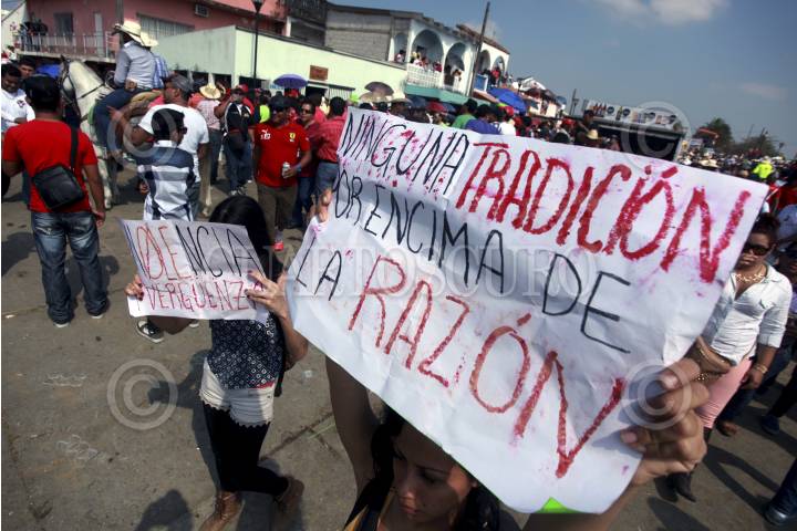 TLACOTALPAN, VERACRUZ, 01FEBRERO2015.- Este domingo se llevó a cabo el tradicional Embalse de Toros 2015, durante las fiestas de la Candelaria, dicho evento se realizó entre golpes y agresiones a los semovientes. Así mismo se registraron diversos asistentes heridos. Durante el acto un grupo de activistas protestó contra el maltrato animal y pidió la cancelación de la fiesta. FOTO: FÉLIX MÁRQUEZ / CUARTOSCURO.COM