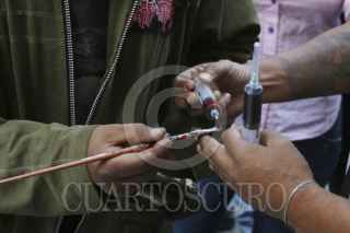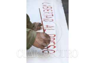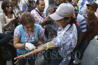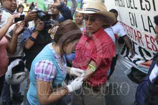 OAXACA, OAXACA, 03FEBRERO2015.- Vendedores ambulantes pertenecientes a la Unión de Artesanos y Comerciantes Oaxaqueños en Lucha (Uacol) se manifestaron en el exterior del palacio de gobierno para exigir la liberación de su dirigente, Adán Mejía López. En la manifestación su papá, Adán Mejía Márquez y otros vendedores se sacaron sangre con lo que pintaron una manta exigiendo la liberación de su primogénito. FOTO: ARTURO PÉREZ ALFONSO /CUARTOSCURO.COM