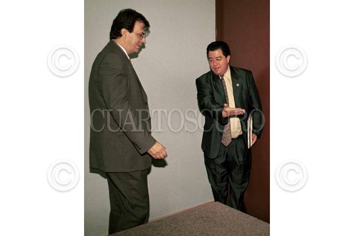 El senador Adolfo Aguilar Zinser comenta sobre la campaña de Vicente Fox con el legislador Rodolfo Becerril durante la sesión de la Comisión Permanente. FOTO: Germán Romero/CUARTOSCURO.COM