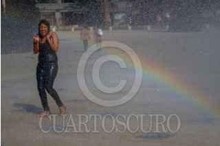 MÉXICO, D.F., 05FEBRERO2015.- Una mujer en la fuente del Monumento a la Revolución se divierte dándose una ducha. FOTO: IVÁN STEPHENS /CUARTOSCURO.COM