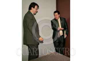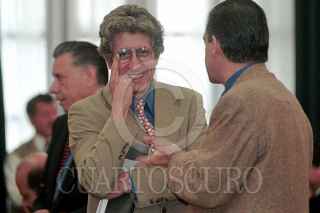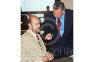 El senador Adolfo Aguilar Zinser comenta sobre la campaña de Vicente Fox con el legislador Rodolfo Becerril durante la sesión de la Comisión Permanente. FOTO: Germán Romero/CUARTOSCURO.COM