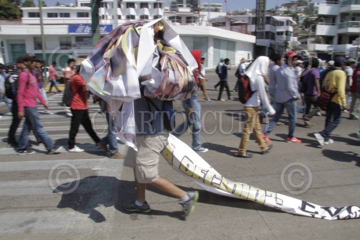 ACAPULCO, GUERRERO, 10FEBRERO2015.- Trabajadores de la educación pertenecientes a la Coordinadora estatal de trabajadores de la educación en Guerrero marcharon sobre la costera Miguel Alemán en demanda del pago de sus salarios y la presentación con vida de los 43 normalistas de Ayotzinapa. Los mentores bloquearon los accesos del aeropuerto y retiraron propaganda electoral. FOTO: BERNANDINO HERNÁNDEZ /CUARTOSCURO.COM