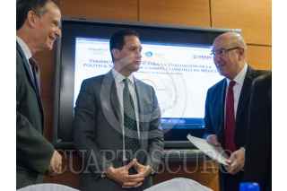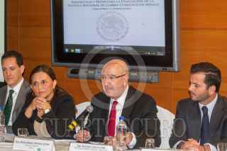 MÉXICO, D.F., 11FEBRERO2015.- Sean Jones, director de la Agencia de los Estados Unidos para el Desarrollo Internacional, y Juan José Guerra Abud, titular de Semarnat, durante la inauguración del Taller Perspectivas y Retos para la Evaluación de la Política Nacional de Cambio Climático en México, que se realizó en un hotel de la ciudad. FOTO: ISAAC ESQUIVEL /CUARTOSCURO.COM