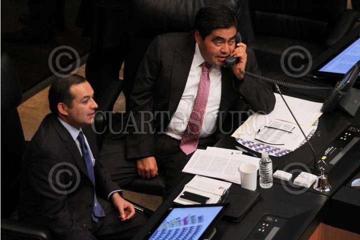 MÉXICO, D.F., 12FEBRERO2015.- Emilio Gamboa Patrón, coordinador de la bancada del Partido Revolucionario Institucional, habla por teléfono, con Miguel G. Barbosa, presidente del Senado de la República y Ernesto Cordero, senador por el Partido Accion Nacional, durante la sesión en la Cámara de Senadores. FOTO: ADOLFO VLADIMIR /CUARTOSCURO.COM