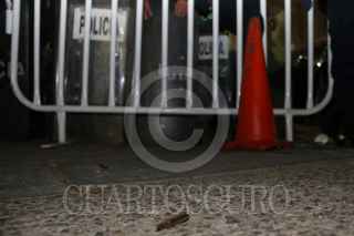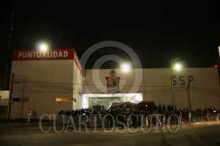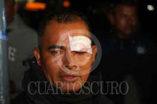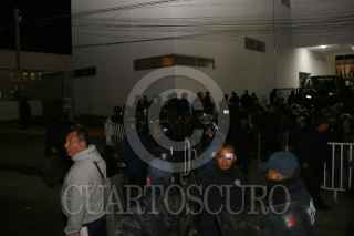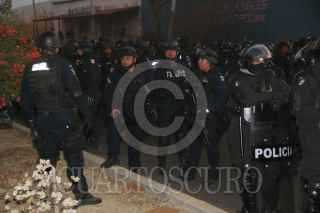 SANTA MARÍA COYOTEPEC, OAXACA, 13FEBRERO2015.- Elementos de la Policía Federal y Agentes Estatales de Investigación intentaron desalojar a los más de 2 mil policías estatales que se mantienen en paro de labores en el cuartel del municipio de Santa María Coyotepec. Los PF y AEI ingresaron por la fuerza al cuartel en donde efectuaron disparos de arma de fuego, como resultado hay un policía parista herido de bala y 5 más con lesiones menores. Al momento los federales se mantienen a menos de 200 metros del cuartel. Los policías huelguistas están armados únicamente con palos, escudos y piedras, mientras que los AEI y PF portan equipo anti motín y rifles de alto poder. FOTO: ARTURO PÉREZ ALFONSO /CUARTOSCURO.COM