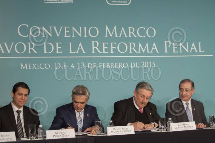 MÉXICO, D.F., 13FEBRERO2015.- José Ramón Amieva Gálvez, consejero Jurídico y de Servicios Legales del GDF y el Jefe de Gobierno Miguel Ángel Mancera, durante la firma de convenio marco en favor de la Reforma Penal en la Suprema Corte de Justicia de la Nación. Con la cual las autoridades capitalinas asignaron a título gratuito y por tiempo indefinido inmuebles que se localizan en los reclusorios sur, norte y oriente, a fin de que en ellos se instalen los juzgados especializados en procesos penales federales y las salas de oralidad. FOTO: MOISÉS PABLO /CUARTOSCURO.COM