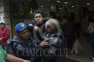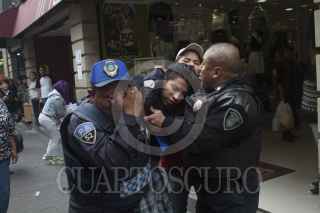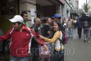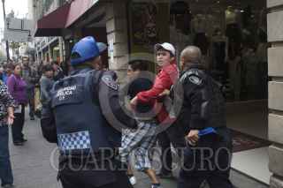 MÉXICO, D.F., 13FEBRERO2015.- Un vendedor informal de los llamados "toreros" fue detenido por dos policías en la calle 5 de Febrero en el Centro Histórico, el afectado les alegaba que lo dejarán ir, sin embargo, los uniformados le informaban que lo iban a remitir, fue hasta cuando llegaron sus compañeros del informal que lograron zafarlo de los policías a base de jalones, empujones y gritos. Al término del zafarrancho uno de los vendedores señalo que siempre los hostigan por que se niegan a pagarles la cuota que va desde los cien hasta los doscientos pesos. FOTO: MOISÉS PABLO /CUARTOSCURO.COM