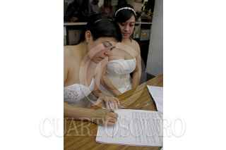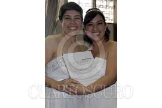 MÉXICO, D.F., 14FEBRERO2015.- Idalí y Ruth, dos mujeres de Monterrey, Nuevo León, encontraron el amor una en la otra, y decidieron unir sus vidas en matrimonio durante la celebración del Día del Amor y la Amistad. Sin embargo, en Monterrey no están legalizadas las bodas entre parejas del mismo sexo, por lo que realizaron su boda en la capital del país, en donde sí está permitido. Tomaron sus maletas y llegaron al Distrito Federal en donde contrajeron nupcias por el deseo de estar juntas. Ellas cuentan con el apoyo de sus familias. FOTO: ADRIANA ÁLVAREZ /CUARTOSCURO.COM