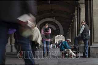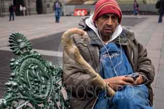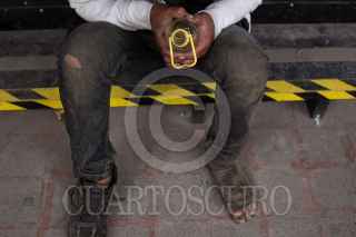 MEXICO, D.F., 14FEBRERO2015.- Dormido y sin un zapato, pero sin soltar la botella culpable de su embotamiento, un hombre sin hogar yace sentado en una banqueta de la Zona Rosa de la ciudad. FOTO: DAVID POLO /CUARTOSCURO.COM