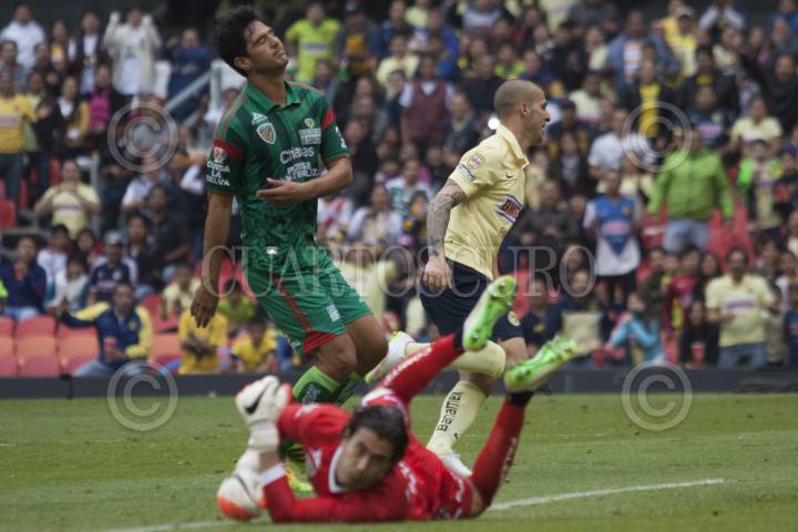 MÉXICO, D.F., 14FEBRERO2015.- Las Águilas del América vencieron por cinco goles a cero a los Jaguares de Chiapas en el Estadio Azteca. Los goles de la victoria fueron de Osvaldo Martíinez, Miguel Samudio, Darío Benedeto y un doblete de Oribe Peralta, con este resultado los de Coapa llegaron a 11 puntos. En la imagen Darío Benedeto doblega a la zaga chiapaneca. FOTO: MOISÉS PABLO /CUARTOSCURO.COM