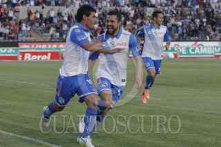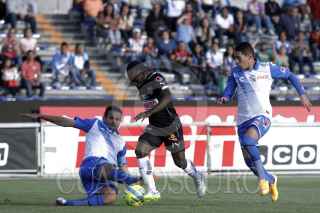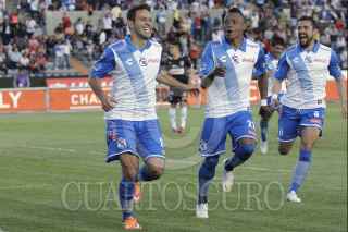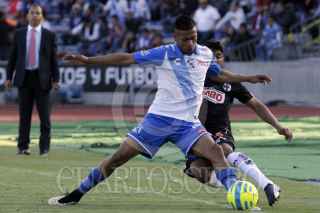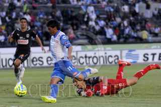PUEBLA, PUEBLA., 14FEBRERO2015.- Matías Alustiza rinde al portero Juan Ibarra del Monterrey en jugada del partido entre el Puebla de la Franja y los Rayados del Monterrey en partido correspondiente a la jornada 6 de la liga MX celebrado en el estadio universitario de la BUAP. FOTO: HILDA RÍOS/ CUARTOSCURO.COM
