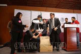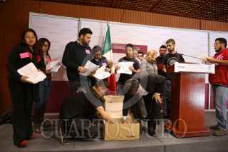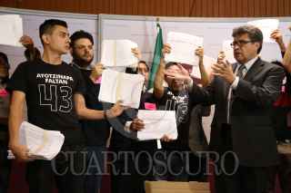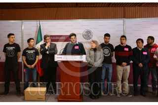 MÉXICO, D.F., 17FEBRERO2015.- Ricardo Monreal Ávila coordinador de Morena acompañado de la diputada Loretta Ortiz y estudiantes de de la organización Red Generación de distintas universidades de Guerrero, presentaron 22 mil firmas en la Cámara de Diputados, donde pidieron se esclarezca el caso Ayotzinapa y una propuesta ante el congreso para solicitar la destitución del presidente de México, Enrique Peña Nieto. FOTO: SAÚL LÓPEZ /CUARTOSCURO.COM