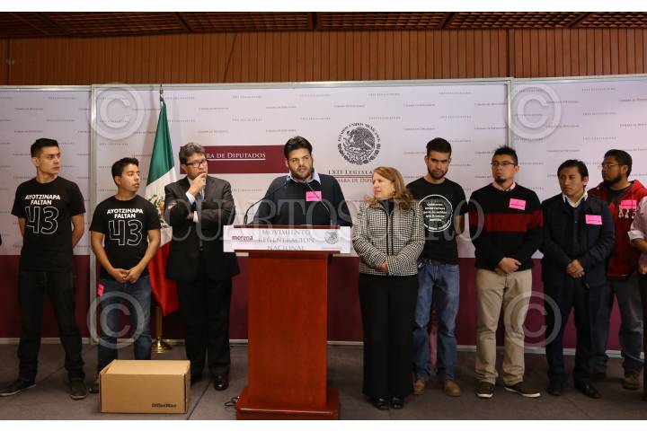 MÉXICO, D.F., 17FEBRERO2015.- Ricardo Monreal Ávila coordinador de Morena acompañado de la diputada Loretta Ortiz y estudiantes de de la organización Red Generación de distintas universidades de Guerrero, presentaron 22 mil firmas en la Cámara de Diputados, donde pidieron se esclarezca el caso Ayotzinapa y una propuesta ante el congreso para solicitar la destitución del presidente de México, Enrique Peña Nieto. FOTO: SAÚL LÓPEZ /CUARTOSCURO.COM