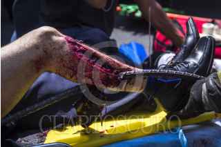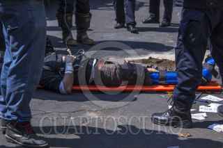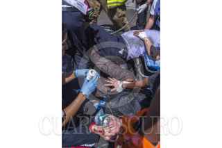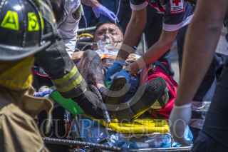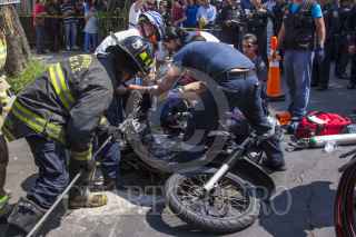 MÉXICO, D.F., 19FEBRERO2015.- Dos presuntos asaltantes sufrieron un accidente sobre la calle de Fernando Montes de Oca esquina con Mazatlan en la colonia Condesa tras chocar en la motocicleta que viajaban con un camión de varillas provocando que una de estas se les enterrara a los dos en las piernas por lo que tuvieron que llegar elementos de la policía capitalina, bomberos y paramedicos para quitarles los fierros y así poderlos trasladar a un hospital y ser atendidos. Tras el accidente, un joven denuncio a los dos heridos de minutos antes haberlo despojado de 2 celulares y 30 pesos. FOTO: ENRIQUE ORDÓÑEZ /CUARTOSCURO.COM