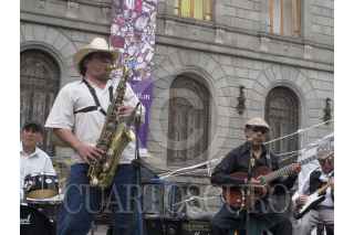 MÉXICO, D.F., 20FEBRERO2015.- Una banda de blues ameniza la tarde de los paseantes de la calle de Tacuba en el centro Histórico este tipo de espectáculos se complementan con las actividades de la Feria del Libro del Palacio de Minería. FOTO: MOISÉS PABLO /CUARTOSCURO.COM