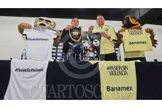 MÉXICO, D.F., 20FEBRERO2015.- “La rivalidad es únicamente deportiva e invitamos a todos los aficionados a sumarse a esta iniciativa para vivir la #PasiónSinViolencia”, es el mensaje conjunto de los clubes Universidad y América, con motivo del juego de la Jornada 7 del torneo Clausura 2015, que sostendrán este domingo, en el Estadio Olímpico Universitario. En la casa de los Pumas, el capitán del América, Moisés Muñoz, y Darío Verón, de los Pumas, se unieron para enviar un mensaje para erradicar la violencia en los estadios a los miles de seguidores de ambas escuadras. FOTO: UNAM /CUARTOSCURO.COM