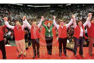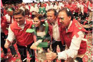 MONTERREY, NUEVO LEÓN, 22FEBRERO2015.- Rodrigo Medina, gobernador del Estado; Ivonne Álvarez, candidata del PRI a la gubernatura del Estado; César Camacho, presidente del CEN del PRI; y Emilio Gamboa Patrón, coordinador de los Senadores del PRI, durante la toma de protesta de Ivonne Álvarez García como candidata del PRI a la gubernatura del estado. FOTO: PRI /CUARTOSCURO.COM