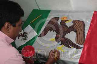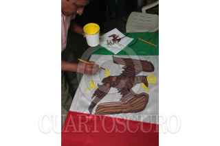 VILLAHERMOSA, TABASCO, 23FEBRERO2015.- Con trazos calculados y pulso hábil, un pintor imprime de manera artesanal el Águila Real sobre una bandera mexicana, que simboliza el lábaro patrio, en vísperas de los festejos por el Día de la Bandera. FOTO: MARCO POLO GUZMÁN HERNÁNDEZ /CUARTOSCURO.COM