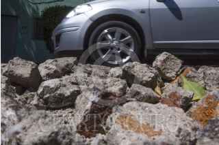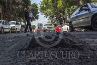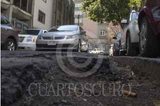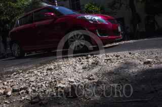 MÉXICO, D.F., 24FEBRERO2015- Un gran bache que mide lo anche de la calle de Cuernavaca en la colonia Condesa, tuvo que ser rellenado con cascajo por los vecinos ya que las autoridades no han acudido ha rellenerlo desde hace ya mas de 4 meses que este se genero. FOTO: ENRIQUE ORDÓÑEZ /CUARTOSCURO.COM