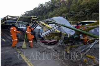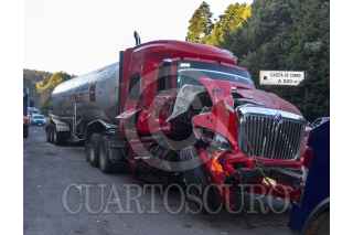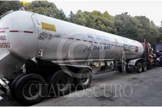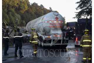 MÉXICO, D.F., 24FEBRERO2015.- Un tráiler que transportaba una salchicha con gas de la empresa Nieto perdió el control y volcó sobre su costado derecho en la carretera libre México-Toluca a la altura de la caseta de pago donde dos autos y una barra de contención resultaron dañadas. FOTO: ARMANDO MONROY /CUARTOSCURO.COM