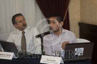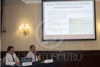 MÉXICO, D.F., 26FEBRERO2015.- Alejandro Calvillo, director El Poder del Consumidor y Raúl Estrada, director de comunicación Greenpeace, durante la conferencia de prensa en la cual se hablo del etiquedo de los alimentos en donde se exige que se precise la presencia de transgénicos. Organizaciones que integran la Alianza por la Salud Alimentaria demandaron al Gobierno mexicano y al Congreso iniciar una investigación a funcionarios de la Secretaría de Economía (SE) y de la Comisión Federal para la Protección contra Riesgos Sanitarios (Cofepris) por la defensa que han emprendido de tabacaleras y grandes corporaciones de comida chatarra que se oponen al etiquetado de vanguardia propuesto e implementado por Australia y Ecuador. FOTO: MOISÉS PABLO /CUARTOSCURO.COM