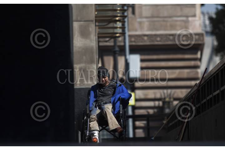 MÉXICO, D.F., 26FEBRERO2015.- Un hombre en silla de ruedas que "vive" en las inmediaciones del Banco de México, el cual se ubica en la calle de Madero y Eje Central. FOTO: MOISÉS PABLO /CUARTOSCURO.COM