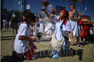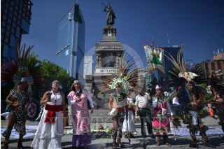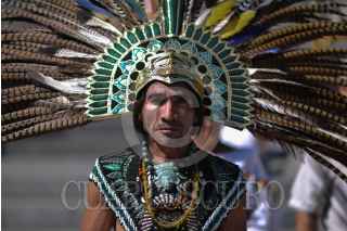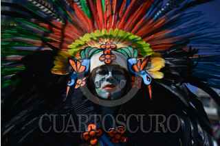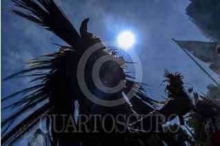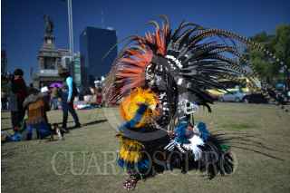 MÉXICO, D.F., 28FEBRERO2015.- Grupos de danzantes prehispanicos, se congregaron en el monumento a Cuauhtémoc, en Paseo de la Reforma, para realizar una ceremonia recordando la muerte del último Tlatuani mexica del Mexico-Tenochtitlan. "El águila que desciende" en náhuatl, asumió el poder en 1520, un año antes de la toma por Hernán Cortés. A partir del siglo XIX su figura fue usada con fines nacionalistas, teniendo máximo símbolo la inauguración del Monumento a Cuauhtémoc, obra de Miguel Noreña, durante la dictadura porfirista. Los participantes, resaltaron el legado de resistencia del líder militar mexica hasta el último día de su muerte. FOTO: ADOLFO VLADIMIR /CUARTOSCURO.COM