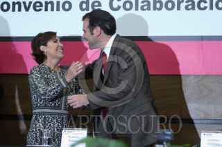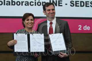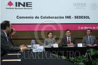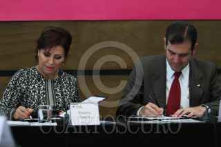 MÉXICO, D.F., 02MARZO2015.- Lorenzo Córdova, presidente del Instituto Nacional Electoral y Rosario Robles, titular de la Secretaria de Desarrollo Social, firmaron un convenio de colaboración para las elecciones 2015. La SEDESOL y el INE se comprometen a; adelantar la entrega de apoyos, suspender reuniones masivas con los beneficiarios de programas sociales, suspender propaganda gubernamental, resguardar los recursos, sensibilizar y capacitar al personal y difundir información sobre este programa de blindaje electoral. FOTO: ISABEL MATEOS /CUARTOSCURO.COM