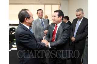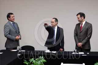 MÉXICO, D.F., 02MARZO2015.- Eduardo Gurza Curiel, rindió protesta como nuevo titular de la Unidad Técnica de Fiscalización del INE. En la imagen, lo felicita Alfredo Cristalinas, ex titular del área, así como Edmundo Jacobo Molina, secretario Ejecutivo y el consejero Electoral Benito Nacif Hernández. FOTO: CUARTOSCURO.COM