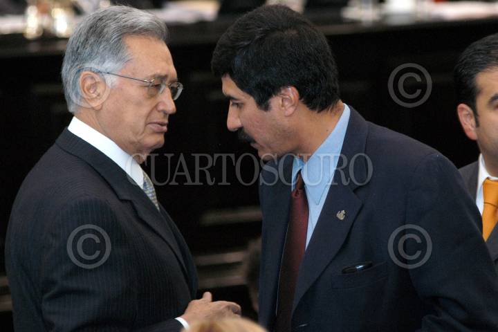 MEXICO, D.F., 04ABRIL2006.- Los senadores Manuel Bartlet, PRI y Javier Corrak, PAN, durante la sesión ordinaria en el Senado. FOTO: Moisés Pablo/CUARTOSCURO.COM