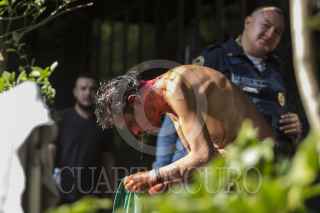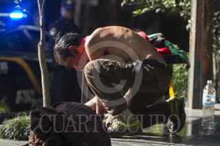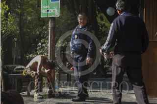 MÉXICO, D.F., 04MARZO2015.- Un indigente que ronda las calles de la colonia condesa sufre de una herida en el cuello que no logra curarse desde hace varios días, vecinos de la demarcación sostienen que las ambulancias al saber de quien se trata nunca llegan. Un par de elementos de la policía llegaron al lugar para informarse de la situación del hombre. FOTO: ISABEL MATEOS /CUARTOSCURO.COM