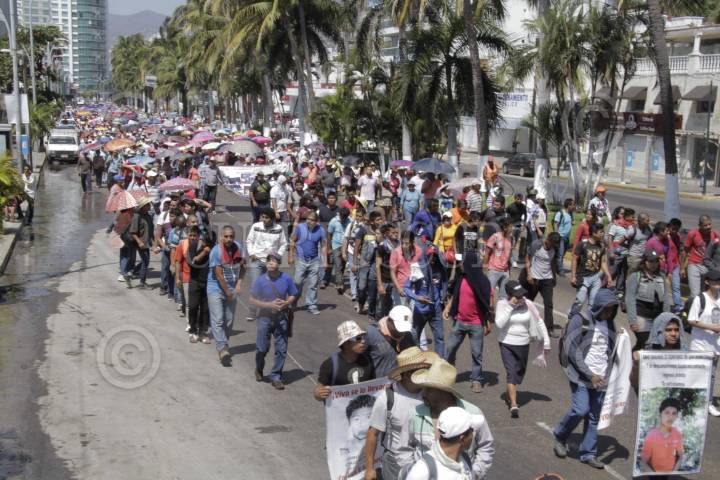 ACAPULCO, GUERRERO, 04MARZO2015.- Integrantes de la Coordinadora Estatal de Trabajadores de la Educación de Guerrero y padres de familia de los 43 normalistas desaparecidos el 26 de septiembre en Iguala, marchan sobre la Costera Miguel Alemán. Acompañados, también por integrantes del Sindicato Único de Servidores Públicos del Estado de Guerrero, demandan la presentación con vida de los estudiantes de la Normal Rural “Raúl Isidro Burgos”. Los burócratas, que trabajan en el plano educativo, reclaman les entreguen una plaza de trabajo toda vez que solo lo hacen de manera interina. Son 22 trabajadores entre maestros, personal administrativo y de apoyo los que no cuentan con una plaza. Los manifestantes salieron de la Diana y caminan sobre la Costera hacia la Base Naval. Se encuentran a la altura de las llamadas Torres Acapulco, cerca ya de la Base Naval. FOTO: BERNANDINO HERNÁNDEZ /CUARTOSCURO.COM