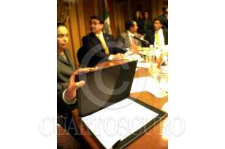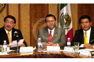 Eric Villanueva Mukul, presidente de la mesa directiva de la Cámara de Diputados, Jaime Vázquez Castillo, vicepresidente de la Mesa Directiva de la Cámara de Diputados, y Horacio Duarte Olivares, Presidente Municipal de Texcoco, durante la firma de un acuerdo de cooperación para el fortalecimiento del federalísmo y para la reforma del estado con presidentes municipales de divesos estados de la República. FOTO: Pedro Mera/CUARTOSCURO.COM