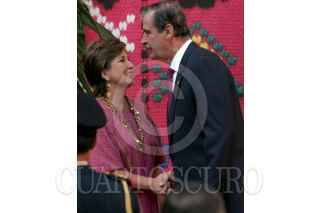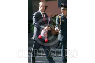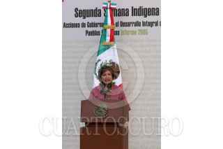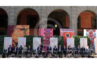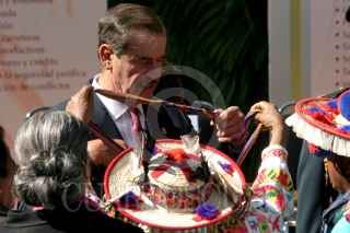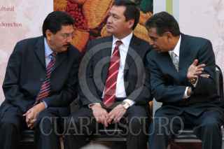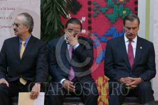 MEXICO, D.F., 05ABRIL2006.- Ulises Ruíz, gobernador de Oaxaca, Miguel Osorio Chong, gobernador de Hidalgo y Fidel Herrera, gobernador de Veracruz, durante el informe de la Segunda Semana Indigena en el patio central del Palacio Nacional. FOTO: Moisés Pablo/CUARTOSCURO.COM