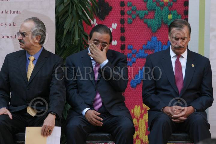 MEXICO, D.F., 05ABRIL2006.- Ulises Ruíz, gobernador de Oaxaca, Miguel Osorio Chong, gobernador de Hidalgo y Fidel Herrera, gobernador de Veracruz, durante el informe de la Segunda Semana Indigena en el patio central del Palacio Nacional. FOTO: Moisés Pablo/CUARTOSCURO.COM