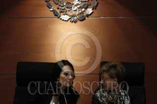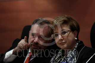 MÉXICO, D.F., 08MARZO2015.- Manuel Hallivis Pelayo, presidente del Tribunal Federal y Justicia Fiscal y Administrativa; y Margarita Luna Ramos, ministra de la Suprema Corte de Justicia de la Nación; durante el Foro realizado en la sede del Tribunal con motivo del día internacional de la Mujer. FOTO: IVÁN STEPHENS /CUARTOSCURO.COM