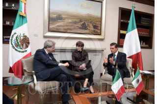 MEXICO, D.F., 10MARZO2015.- En el marco de la Visita Oficial que realiza a México, Paolo Gentiloni, Ministro de Asuntos Exteriores y Cooperación Internacional de la República Italiana, se reunió con el Presidente de la República, Enrique Peña Nieto, con quien confirmó el interés de ambos países en dotar de nuevos contenidos la Asociación Estratégica que se estableció en 2012. FOTO: PRESIDENCIA /CUARTOSCURO.COM