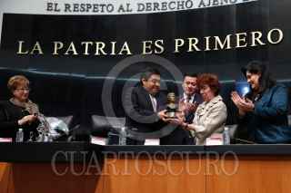 MEXICO, D.F., 10MARZO2015.- En sesión solemne, el senador Miguel Barbosa, Presidente del Senado, entregó el reconocimiento "Elvia Carrillo Puerto" a Carmen Moreno Toscano. Estuvo acompañado por el secretario de gobernación Miguel Ángel Osorio Chong y la magistrada de la Suprema Corte de Justicia de la Nación, Margarita Luna Ramos. FOTO: SENADO /CUARTOSCURO.COM