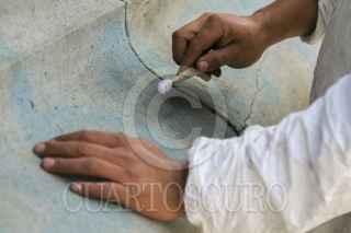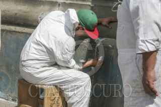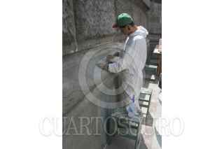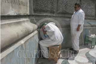MÉXICO, D.F., 11MARZO2015.- Restauradores del Centro Nacional de Conservación del INBA, quitan las pintas que jóvenes denominados anarquistas colocaron en la columna del ángel de la independencia el pasado 26 de Febrero al inicio de la marcha en memoria de los normalistas desaparecidos en Iguala. FOTO: SAÚL LÓPEZ /CUARTOSCURO.COM