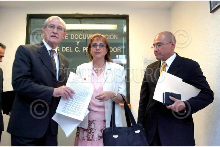 MEXICO, D.F. 05ABRIL2006,- Los diputados Martha Lucía Mícher Camarena (PRD), Jesús González Schmal (Convergencia) y el abogado Pablo Casas Elías, al momento de presentar la denuncia formal para la investigación de los negocios de la familia Bibriesca Sahagún en las instalaciones de la Procuraduría General de la República. FOTO: CUARTOSCURO.COM