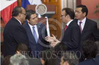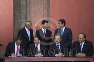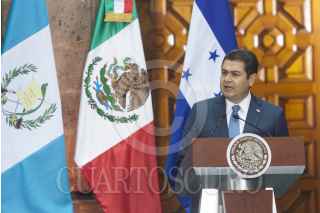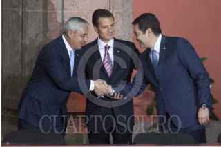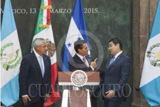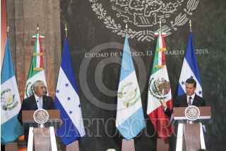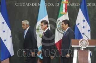 MÉXICO, D.F., 13MARZO2015.- Otto Pérez Molina, Presidente de Guatemala, Enrique Peña Nieto, Presidente de México y Juan Carlos Hernández Alvarado, Presidente de la República de Honduras, durante un mensaje conjunto en Palacio Nacional, esto en el marco de la firma de varios acuerdos de cooperación y entendimiento entre las tres naciones con el fin de fortalecer sus relaciones económicas. FOTO: MOISÉS PABLO /CUARTOSCURO.COM