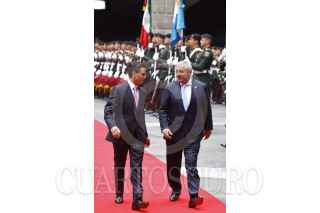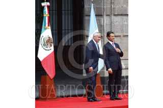 MÉXICO, D.F., 13MARZO2015.- Otto Pérez Molina, Presidente de Guatemala y Enrique Peña Nieto, Presidente de México, durante la recepción oficial que le brindo el mandatario mexicano en el Palacio Nacional. En la imagen se observan a los funcionarios nacionales Miguel Ángel OsorioChong, secretario de Gobernación, José Antonio Mead, secretario de Relaciones Exteriores y Luis Videgaray, secretario de Hacienda. FOTO: MOISÉS PABLO /CUARTOSCURO.COM