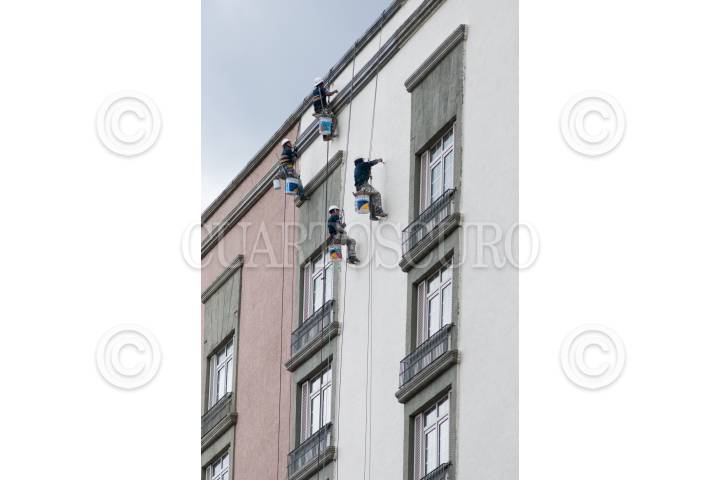 MÉXICO, D.F., 13MARZO2015.- Cuatro trabajadores pintan la fachada de uno de los hoteles ubicado sobre Paseo de la Reforma. FOTO: DIEGO SIMÓN SÁNCHEZ /CUARTOSCURO.COM