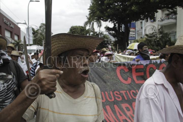 ACAPULCO, GUERRERO, 13MARZO2015.- Unas 1,800 personas entre maestros y organizaciones marcharon por la avenida costera Miguel Alemán en solidaridad con el consejo de ejidos y comunidades opositores a la presa la La Parota (Cecop), que convocó a una movilización para exigir la liberación de su vocero, Marco Suástegui Muñoz, preso desde el 17 de junio pasado en un penal federal de Tepic, Nayarit; además de María de La Luz Dorantes, interna en el penal de Acapulco. La marcha salió poco antes del mediodía del asta bandera y se dirigió al centro internacional Acapulco. donde antes de llegar se pusieron en las afueras de la Embajada Norteamericana donde les gritaron consignas que no metan las manos en las elecciones y que vean los asuntos de los presos políticos y de los migrantes mexicanos en el contingente realizó un mitin. Líderes del CECOP reprocharon que el gobernador interino Rogelio Ortega Martínez que no ha cumplido su palabra de intervenir para agilizar la liberación de Suastegui Muñoz. también gritaron consignas para que la población se abstenga de Votar ya que en algunas comunidades no dejaran entrar a nadie que pertenezca al INE ya no no votaran. FOTO: BERNANDINO HERNANDEZ /CUARTOSCURO.COM